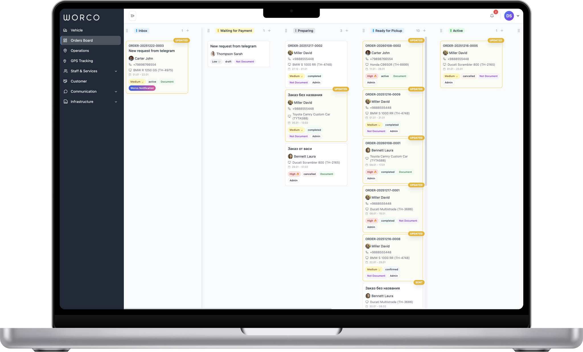 WorCo Rental Software is a specialized platform, designed for real tasks of car rental companies. Unlike generic CRM, the system solves specific problems of car rental companies: from accepting orders through messengers to tracking every scratch on the car. One system replaces Excel tables, dozens of chats and paper documents. Works for any model: car sharing, daily rental or long-term leasing.